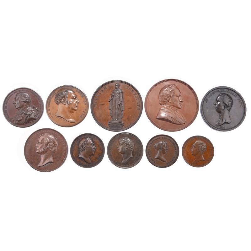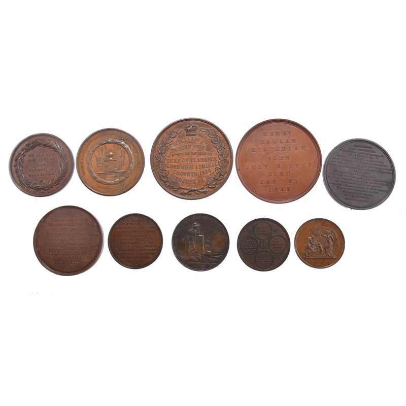 A small quantify of British memorial medals, all AE, including: George III, 48mm, armoured bust left, rev. 'HE HAS RUN HIS COURSES AND SLEEPS IN BLESSINGS' within a wreath, good very fine, H.R.H. Frederick Duke of York 1827, 51mm, head right, by Binfield/Folkard, good very fine or better; William IV, 61mm, statue erected 1845, rev. legend in seven lines within a wreath, nearly extremely fine; Henry Hallam 1859, 63mm, by L.C. Wyon, extremely fine; and six others. [10]
