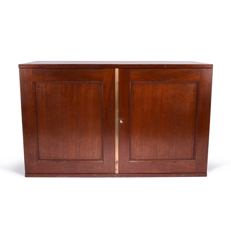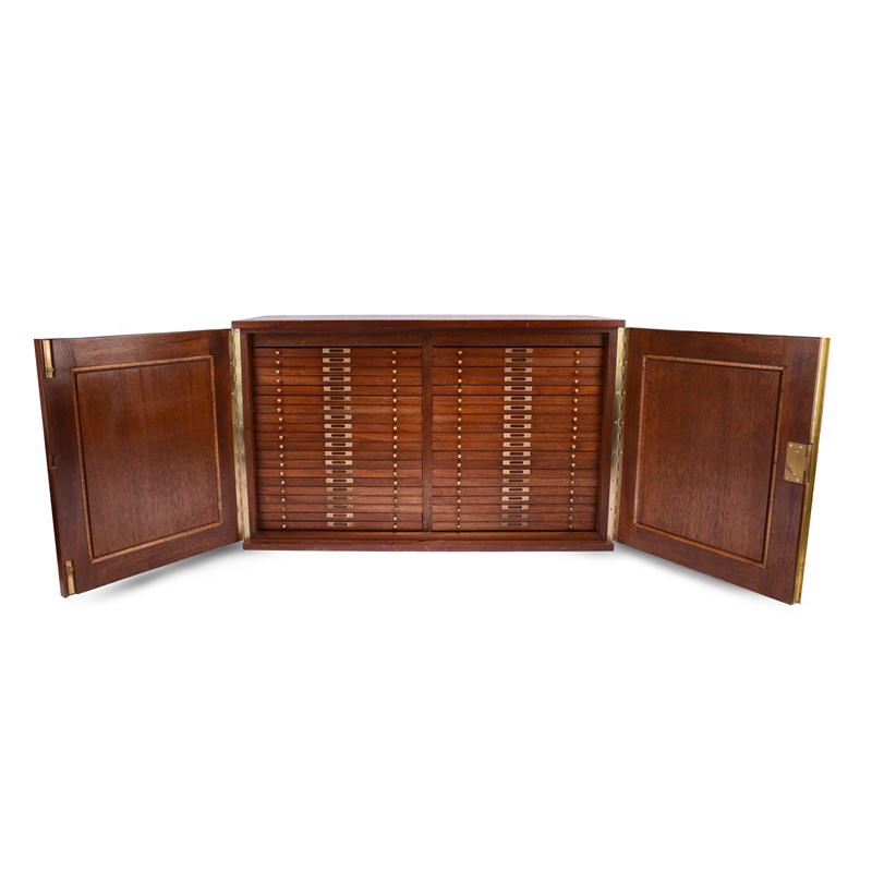 A mahogany coin collector's cabinet, two doors enclosing a total of forty shallow drawers in two columns, brass handles and label holders, each drawer with a green felt liner (not fitted) and providing a 22 x 30 cm area, external dimensions 76 x 47 x 31 cm (H, W, D).