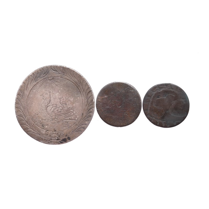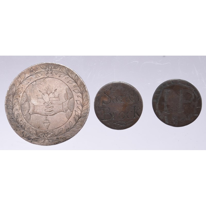 An 18th century engraved silver medal, 48mm, hands clasped below a burning and transfixed heart with a saw passing through it, a padlock below, rev. hen with chicks; together with two engraved copper coins. [3]