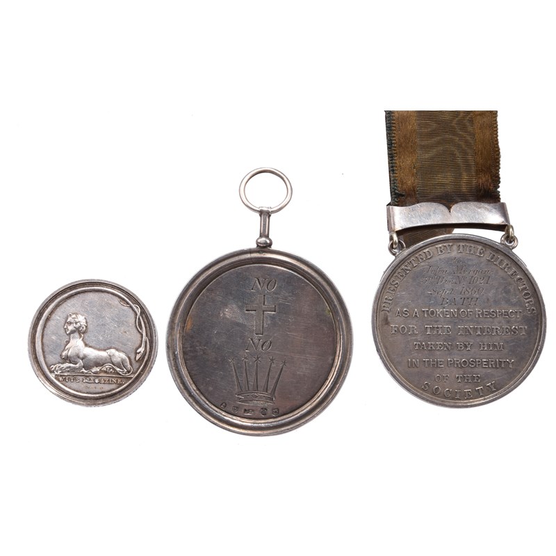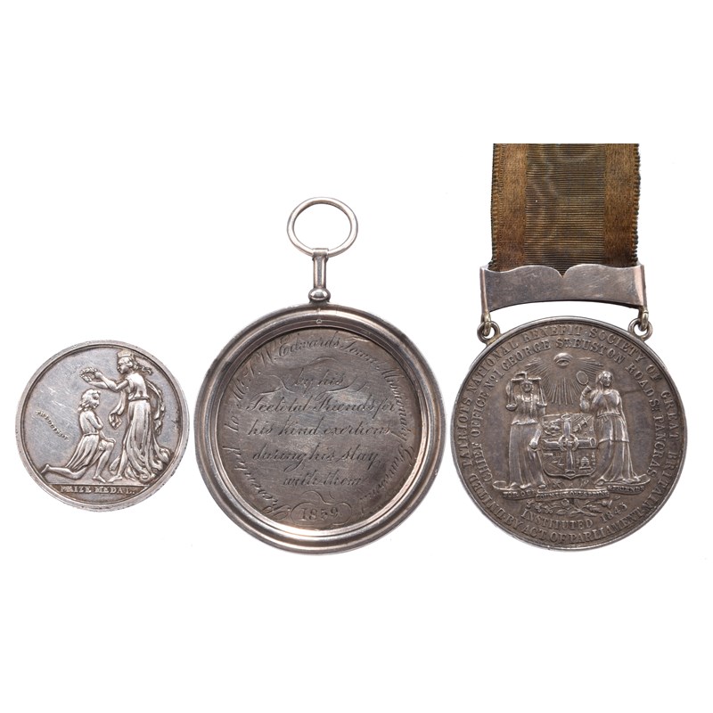 Three silver presentation medals: Wit's Magazine, 36mm, woman presents kneeing man with a wreath, rev. female sphinx, edge engraved (GEO. FOD. MAVOR. NAT. FEB. 10 1790), by Phillips, very fine; Gravesend; engraved, 53mm, cross over crown (J.W. Edwards Town Missionary Gravesend...by his teetotal friends....1859), post and ring suspension, good very fine; United Patriots National Benefit Society of Great Britain, directors medal, 48mm, arms and supporters, rev. legend and engraved award details (John Morgan 3rd Div. No 1021. Sept 1860 BATH), suspension bar and original ribbon, very fine or better. [3]