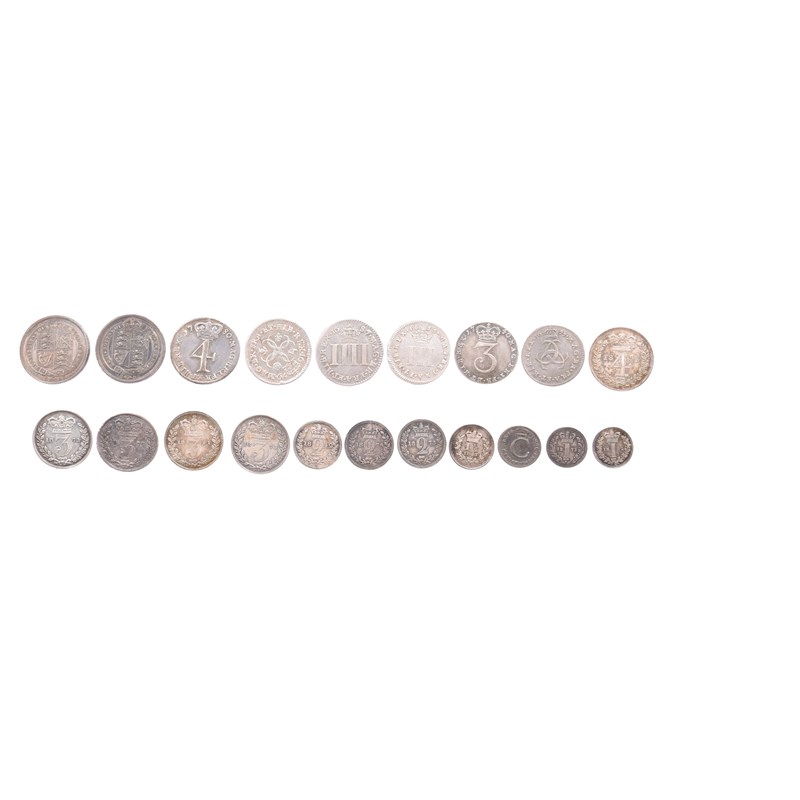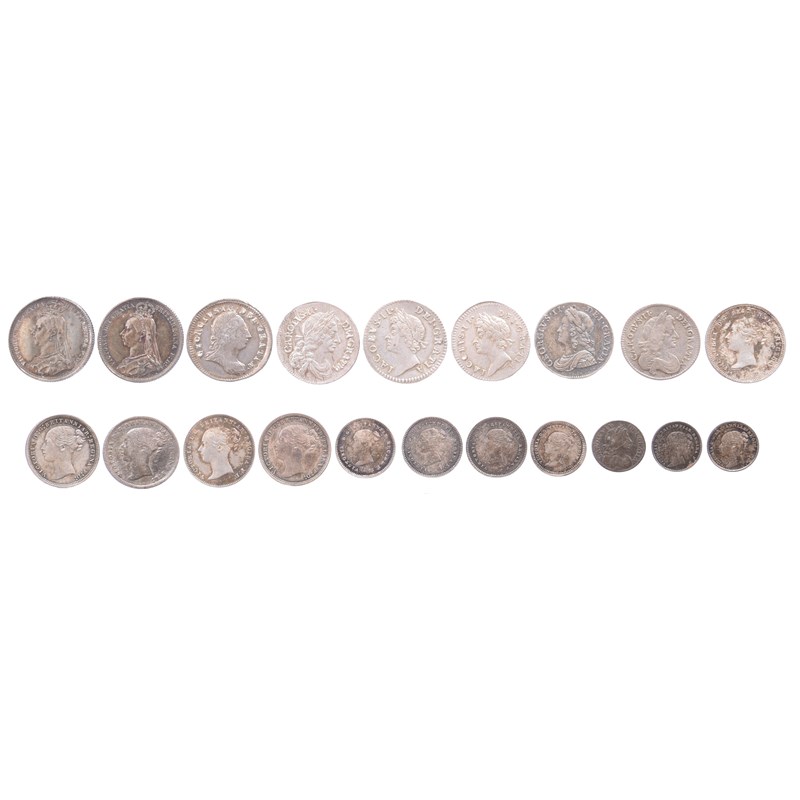 A quantity of 17th to 19th century English and British small denomination silver coins, including: Charles II, fourpence, 1679 (S 3384), very fine; threepence, 1673 (S 3386), nearly very fine; penny 1674 (S 3390), fine; James II, fourpence, 1687, 7 over 6 (S 3414), near very fine; threepence, 1686 (S 3415), very fine; George II, threepence, 1740 (S 3713B), near very fine; George III, fourpence, 1780, young bust (S 3750), good fine; and a variety of Victorian young head issues, including pennies, twopence and three-halfpence, mostly very good grades with some lustre. [20]