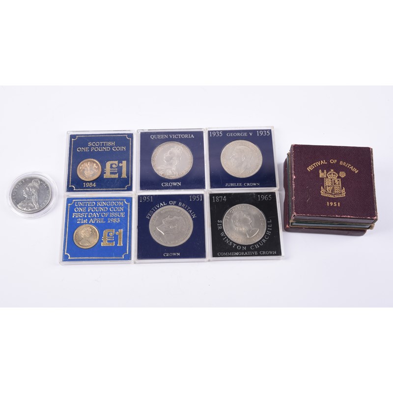 A small quantity of British coins, including: Victoria, silver double florin, 1887, Arabic 1 (S 3923), cleaned, very fine; silver crown, 1889 (S 3921), later case, good very fine; George V, Jubilee crown, 1935 (S 4048), later case, good very fine or better; and various commemorative or specimen issues. [10]