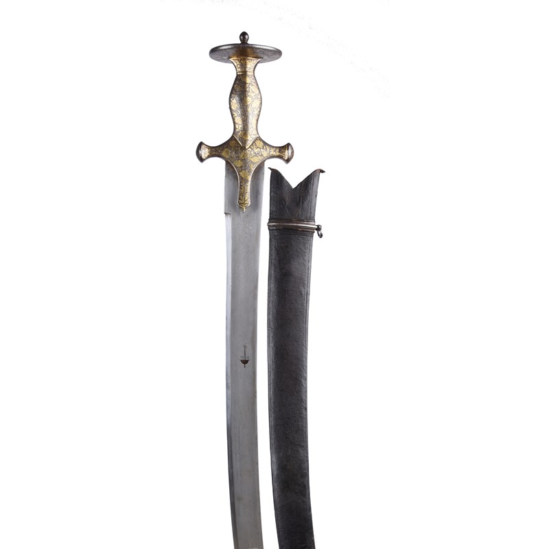 An Indian sword (tulwar), watered steel blade 29 in, and marked with a chhatri (umbrella symbol); steel hilt incised and gilded with flowers; leather scabbard, silver upper band fitted with a hanging loop, brass chape.