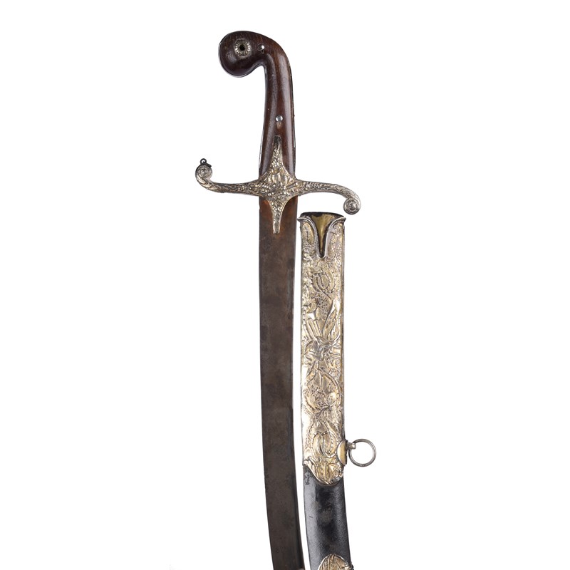λ An eastern sword (shamshir), curved blade of watered steel 31 in.; hilt of kilij type with rhinoceros horn grip terminating in a bulbous hooked pommel, gilt metal cross piece relief decorated in the European manner with trophies of arms amid foliage; scabbard with silver-gilt mounts comprising a long locket and chape and a central band, repousse decoration involving martial trophies with trumpets and drums amid foliage, Greece or Ottoman Balkans.
