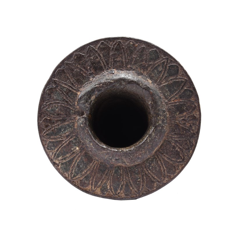 A good 17th century Indian spear head (sang), slightly curved double-edged blade, the base with cut decoration involving monstrous fish, multi-stage socket with a series of bands and with a flanged base, fine incised decoration overall, Tanjore, length 19 in. (49 cm)