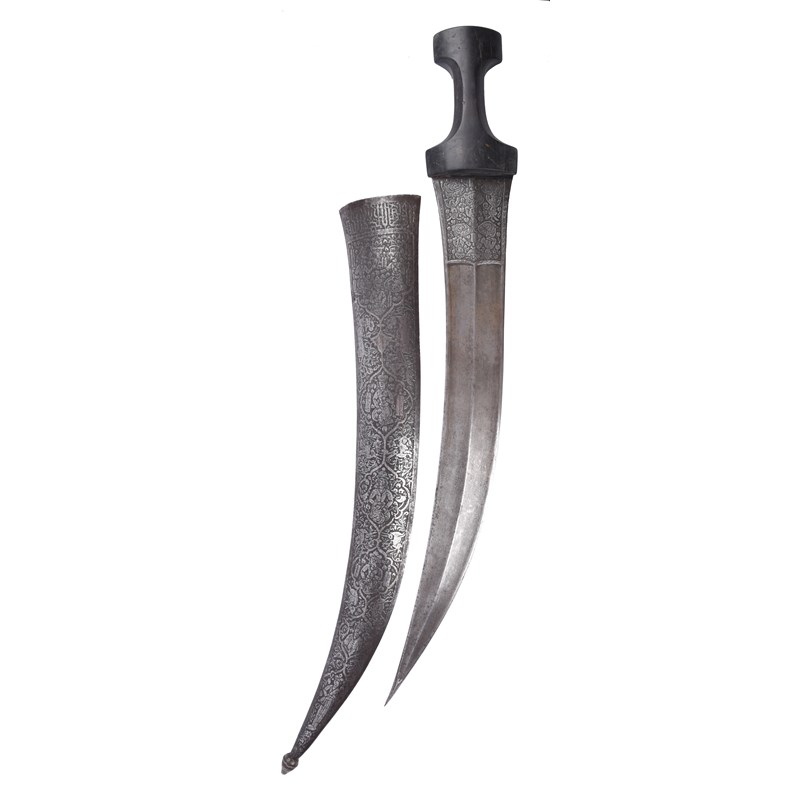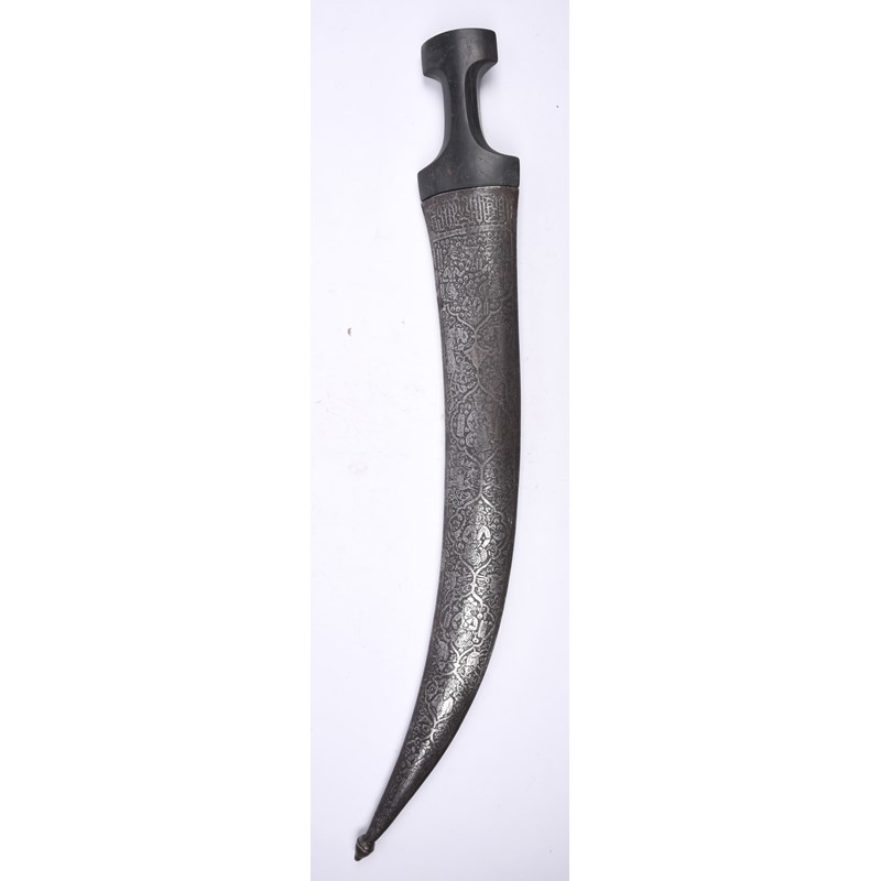 λ A massive Persian dagger (jambiya), curved double edged watered steel blade 23 in. with swollen point and broad fullers forming a medial ridge, forte chiseled with kneeling figures and fruit in bowls to a silver koftgari border; horn hilt of waisted form; steel scabbard chiseled over its entire surface with panels inhabited by kneeling figures, wild beasts and foliage, a band of text at the mouth.