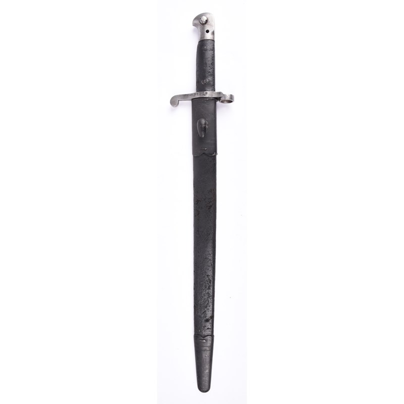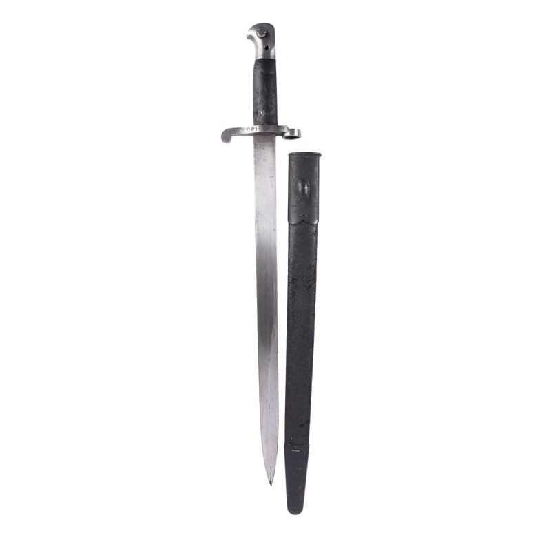 A British 1887 pattern bayonet, Mk II, flat sided spear point blade 18.25 in., marked for Enfield, steel hilt with leather grips, hilt with eastern markings, steel mounted leather scabbard.