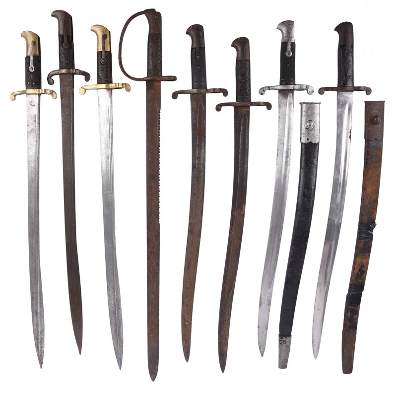 Eight 19th century British bayonets: a pattern 1860 (bar on barrel) short rifle bayonet with yataghan style blade and steel mounted scabbard; another similar; two Whitworth short rifle bayonets; three Sappers and Miners pattern Lancaster bayonets, and a pattern 1879 artillery bayonet with saw backed blade and steel knuckle bow (new production type). [8]