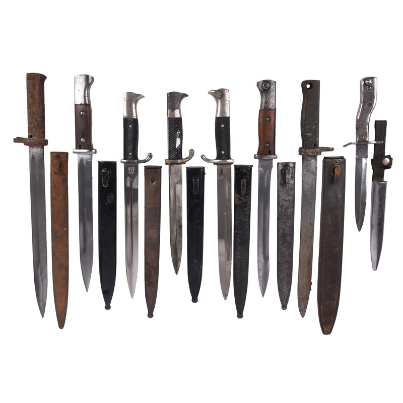 A collection of German bayonets, comprising: a model 1884/98 with sawback removed, and another with plain back, both in steel scabbards; three Great War period Ersatz bayonets with all metal hilts and steel scabbards; and three parade, or 'walking out' bayonets, with plated hilts, beaked pommels, chequered composition grips, steel scabbards. [8]