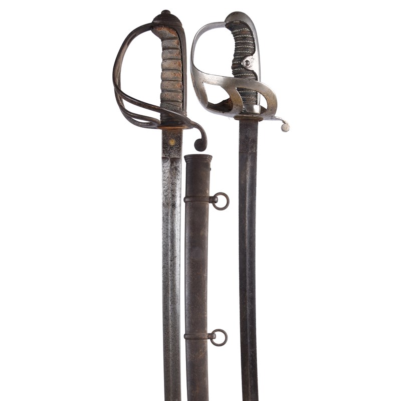 Artillery Volunteers: a British pattern 1821 officer's sword, blade etched with volunteer title and artillery motifs, named for Firmin, steel three bar hilt, steel scabbard; together with a Prussian artillery sword, narrow fullered blade 30.5 in. plated steel guard pierced into a lattice. [2]