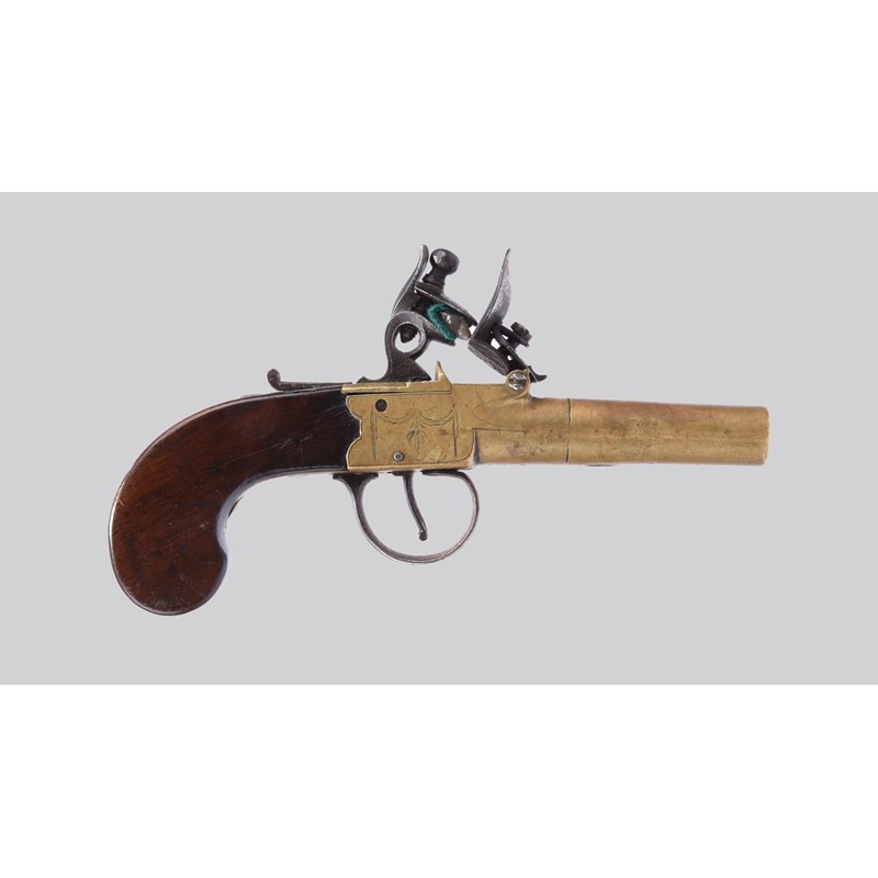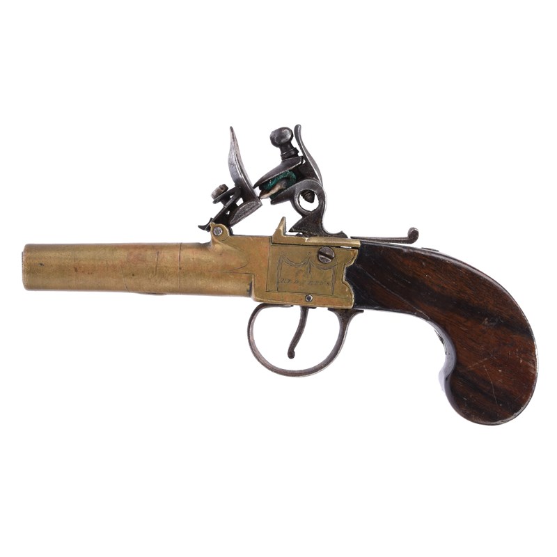 An English 76 bore flintlock pocket pistol, brass turn-off barrel 2.5 in., London Company proof marks, box lock with engraved brass action named Redferns, flat sided wooden grip