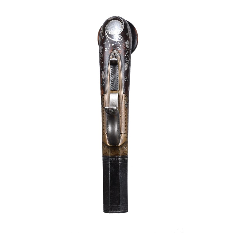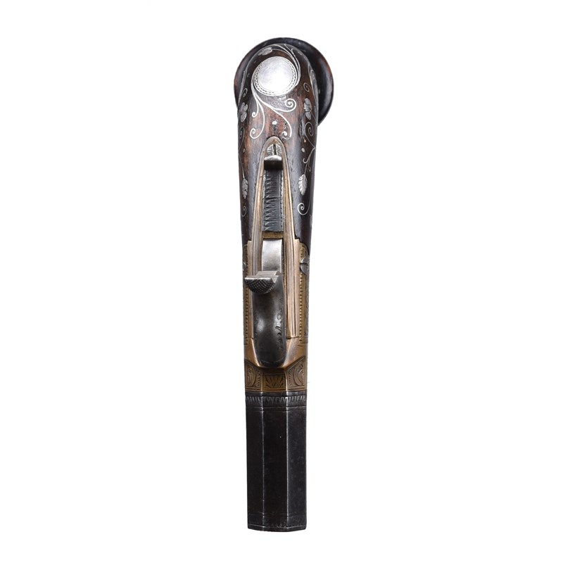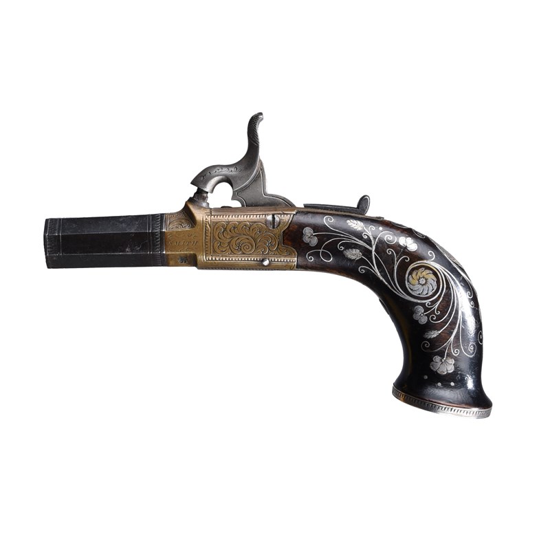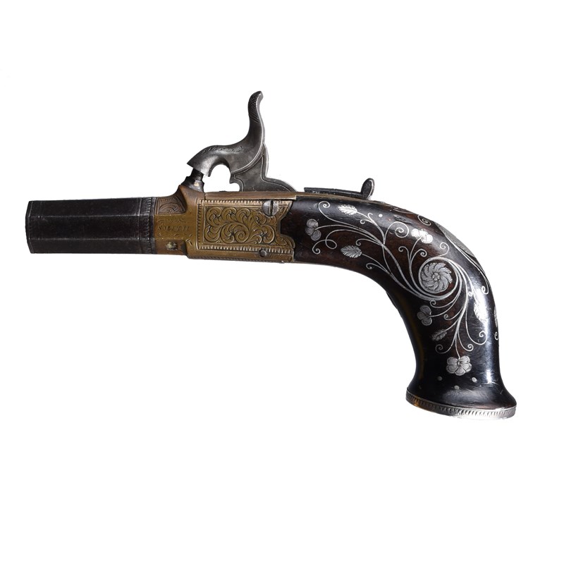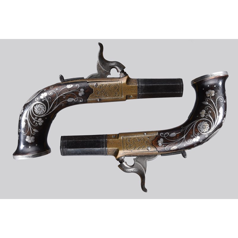 A pair of English 50 bore percussion pocket pistols, octagonal turn off barrels 2 in., Birmingham proof, brass actions well engraved with scrolls within borders and named 'SMITH/ LONDON', sliding safety bars and concealed triggers, grips finely embellished with foliate silver inlay having engraved details to the flower heads and leaves, flared grip terminals bound in silver and with further inlay to the undersides. [2]