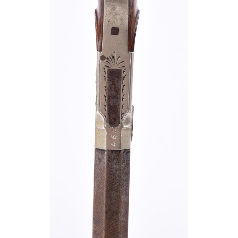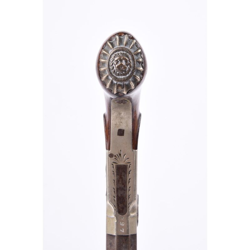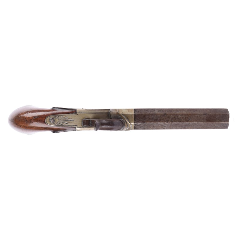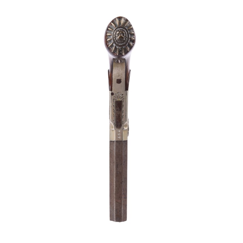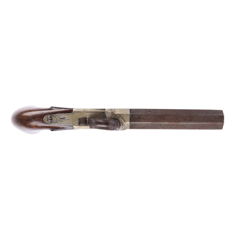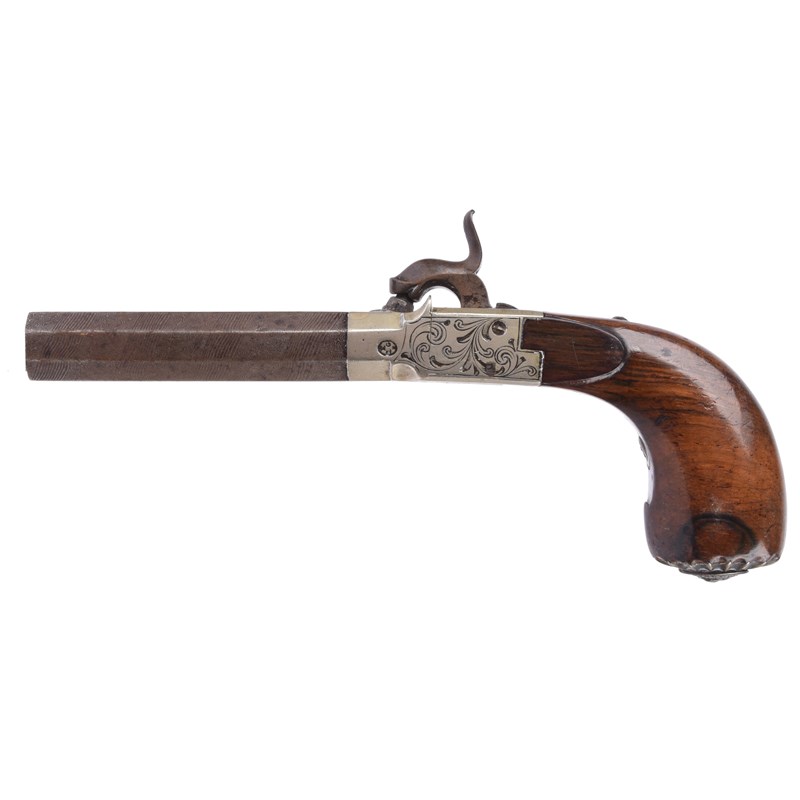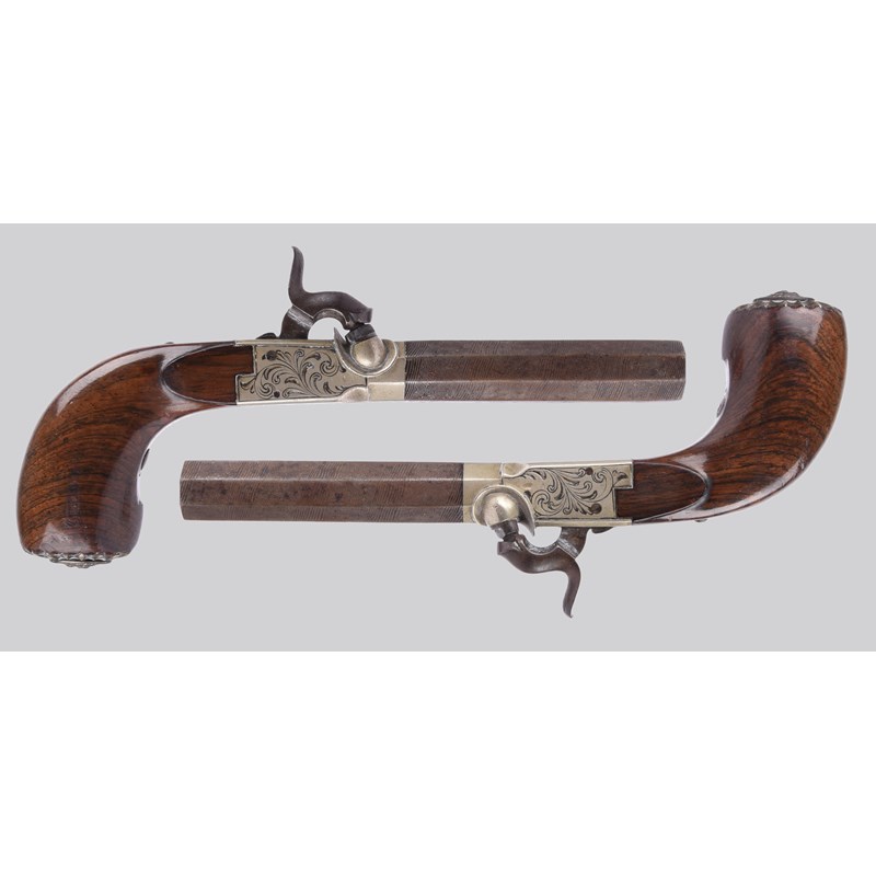 A pair of 19th century Belgian percussion pocket pistols, octagonal turn off barrels 3.5 in., Liege control marks, box locks with scroll engraving, folding triggers, walnut grips with lion mask caps. [2]