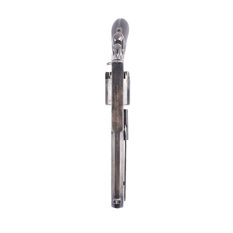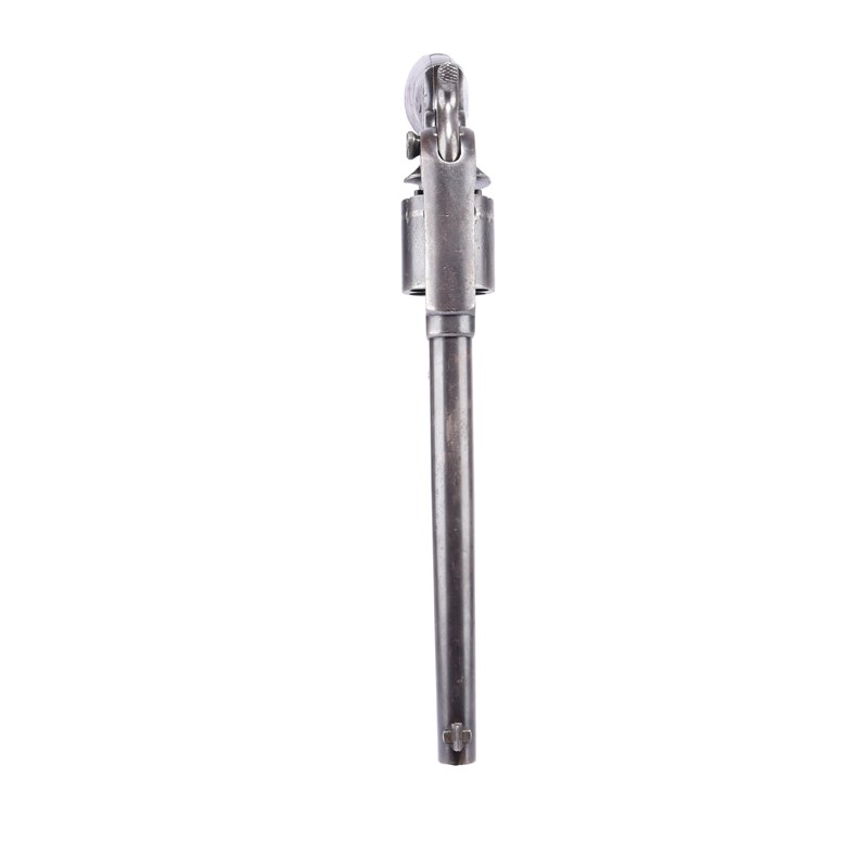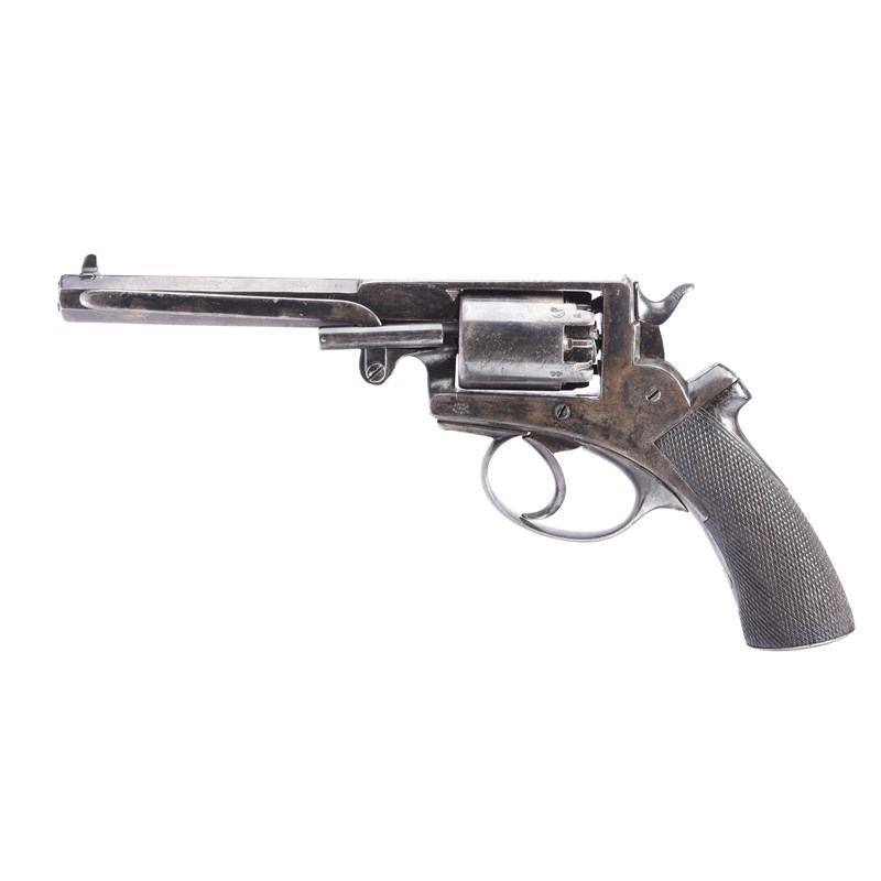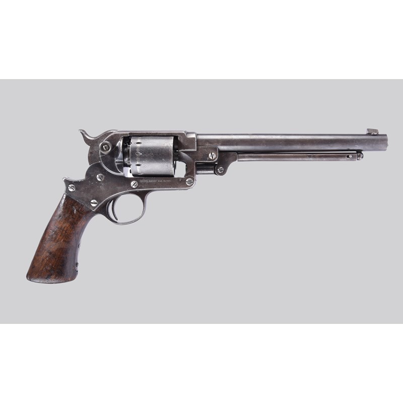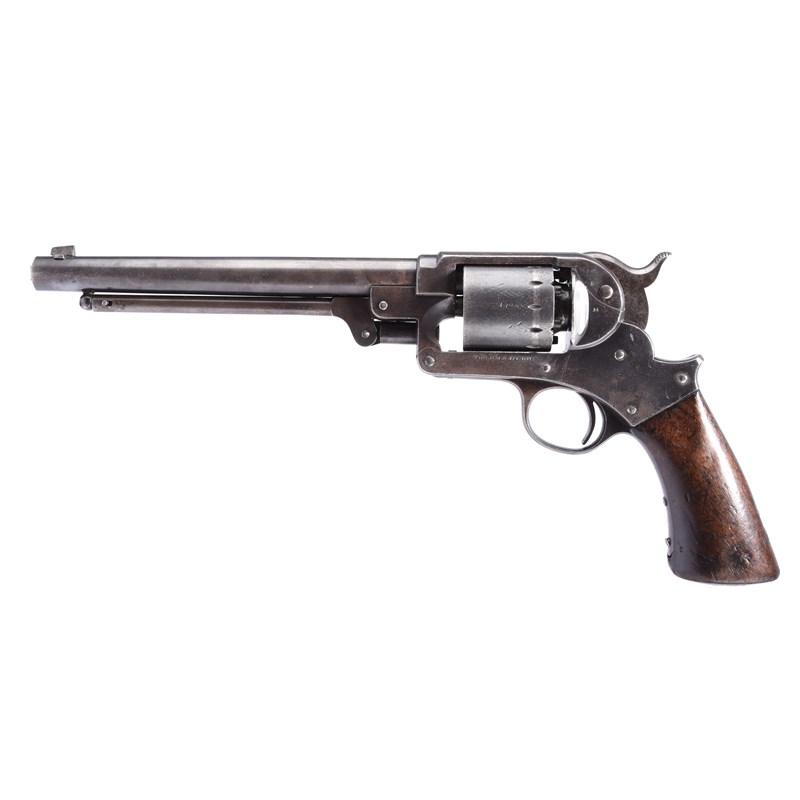 An American Starr Arms .44 model 1863 percussion revolver, round barrel 8 in., hinged frame stamped with patent details, six-shot cylinder, hammer with sighting groove on the nose and chequered spur, single-piece walnut grip, frame with serial number 35651.