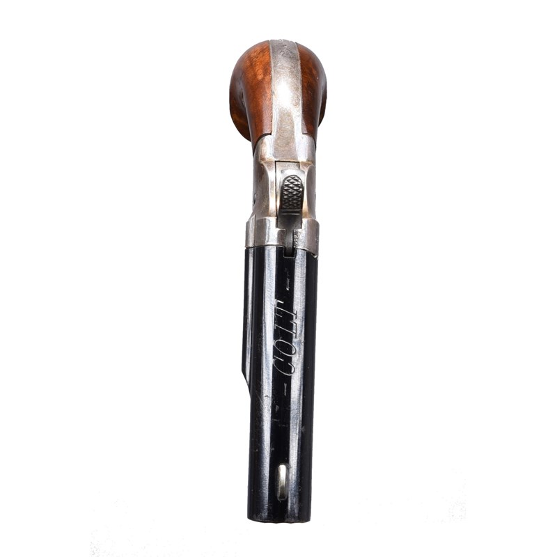 A Colt .41 rimfire Thuer patent 'Third Model' derringer, 2.5 in. blued barrel with foresight and stamped 'COLT' in sloping capitals, Birmingham view and proof marks, plated bronze frame, shrouded trigger, two piece walnut grips. Section 58 - no licence required.