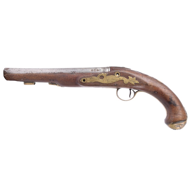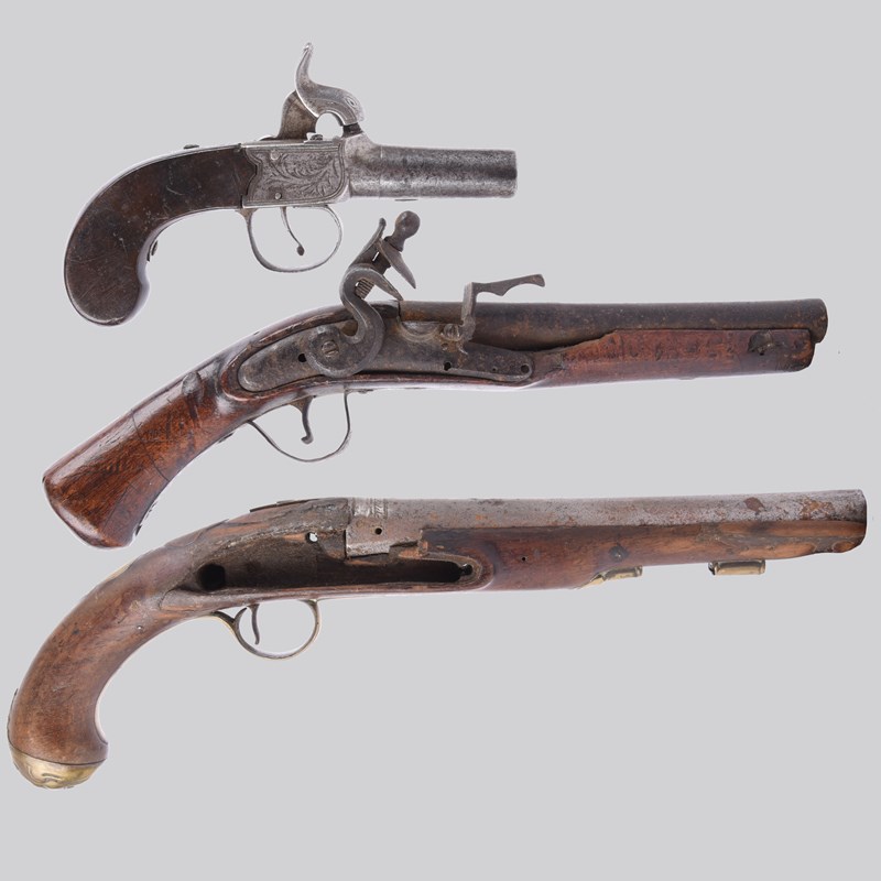 The major parts of three antique pistols: i) the barrel, stock and external lock parts of a flintlock; ii) the barrel and lock of a flintlock with English control marks, stock with ornate brass furniture and carved shell detail; iii) a boxlock percussion pocket pistol, engraved action marked 'D EGG LONDON', internal lockwork missing or damaged. [3]