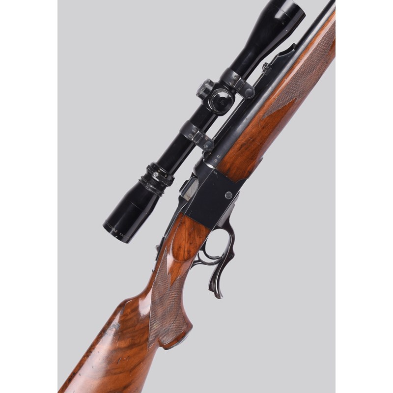 A .243 Winchester falling block No 1 single loading rifle, serial number 132-26271, barrel 22 in., quarter rib with folding back sight, tang safety, chequered pistol grip stock, rubbered butt; fitted with a Burris 3-9x telescopic sight in Ruger rings, and offered with a bipod. Section 1 - FAC or RFD required to purchase.
