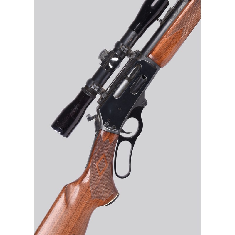 A .444 Marlin lever action Model 444 rifle, serial number 02061973, barrel 22 in. with hooded fore sight, tubular magazine, chequered pistol grip stock, fitted with a Lyman Challenger telescopic sight in quick detach rings. Section 1 - FAC or RFD required to purchase.