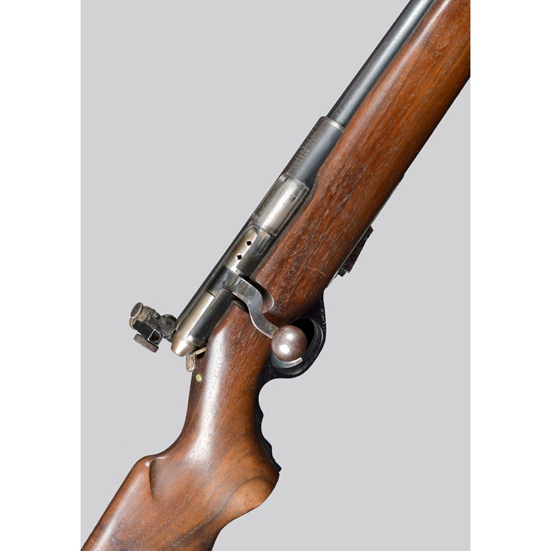 A .22 U.S. Military bolt action training rifle, serial number 40681, 23 in. barrel roll marked with maker's address and stamped 'UNITED STATES PROPERTY' (repeated on the receiver), hooded ring front sight, rear aperture sight adjustable for windage and elevation, cranked bolt handle, detachable box magazine, full stock with synthetic trigger guard. Section 1 - FAC or RFD required to purchase.