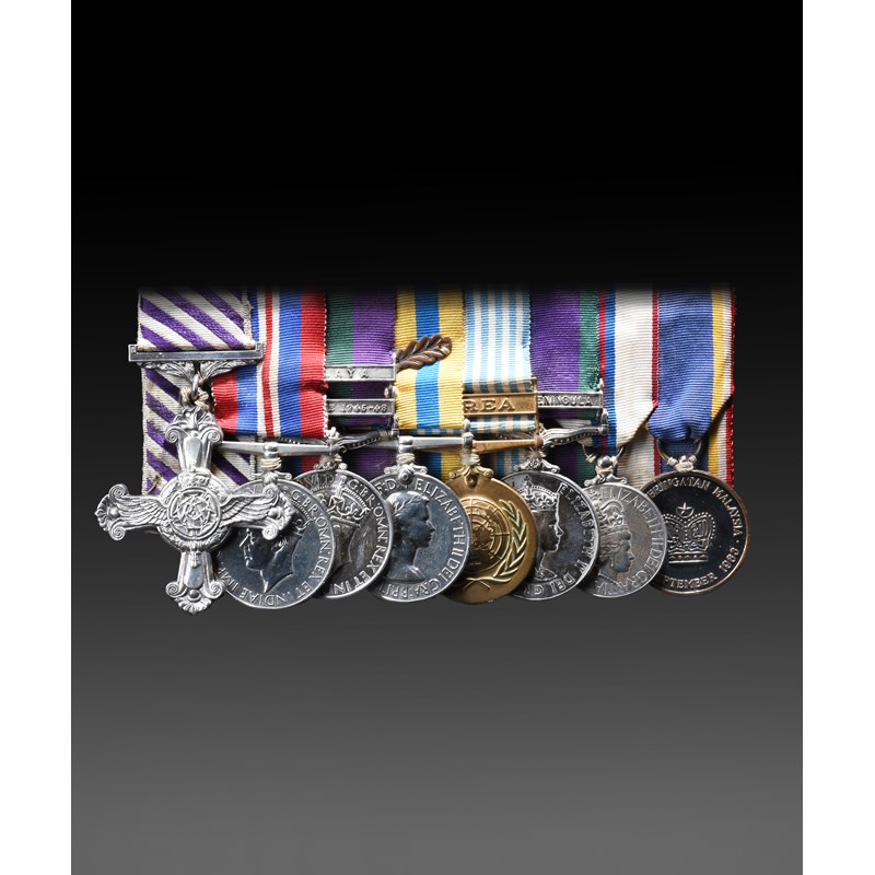 The scarce Korean War D.F.C. group of eight to Major (later Major General) Arthur George Ernest Stewart-Cox, Royal Artillery: Distinguished Flying Cross, George VI issue (2nd Type), reverse dated 1952; British War Medal 1939-45; General Service Medal 1918-62, George VI (IND IMP), 2 clasps: Palestine 1945-48, Malaya (CAPT. A.G.E. STEWART-COX. R.A.), officially adjusted naming; Korea Medal, with Mention in Despatches emblem (CAPT. A.G.E. STEWART-COX. D.F.C. R.A.), official alteration to surname; United Nations Korea Medal; General Service Medal 1962-2007, clasp: Malay Peninsula (MAJOR A.G.E. STEWART-COX. D.F.C. R.A.); Jubilee Medal 1977; Pingat Peringatan Malaysia Medal, bronze; court mounted, all about very fine or better; together with the corresponding mounted group of dress miniatures; and a Republic of Korea Korean Veteran's Association Medal, with enamelled suspension brooch.