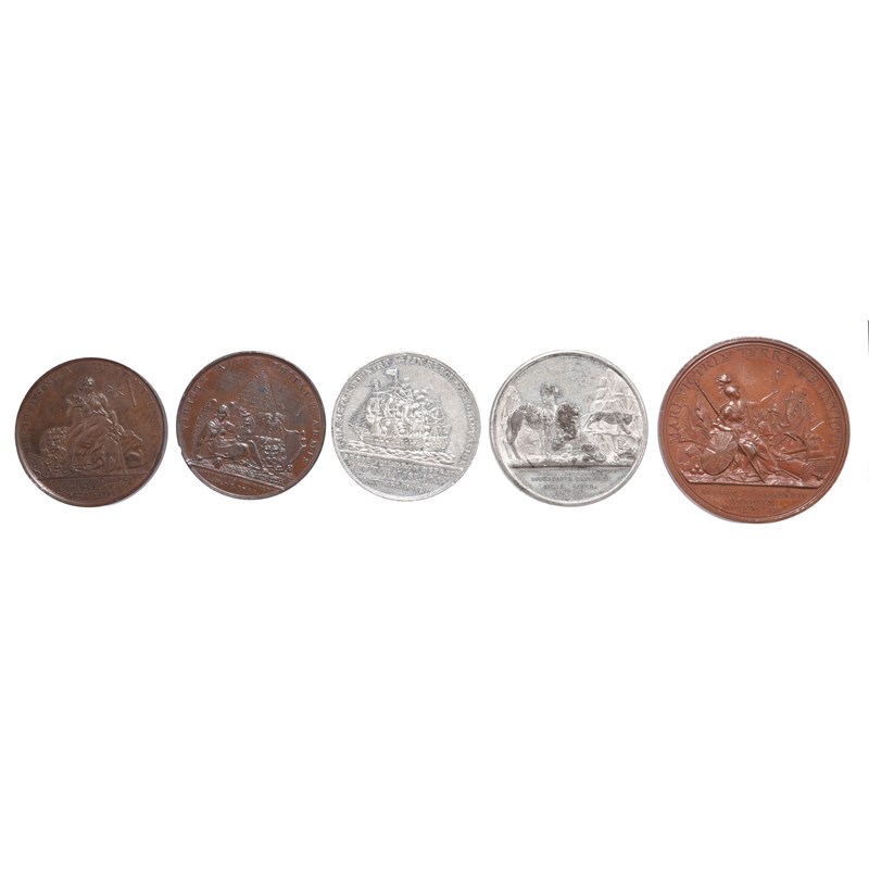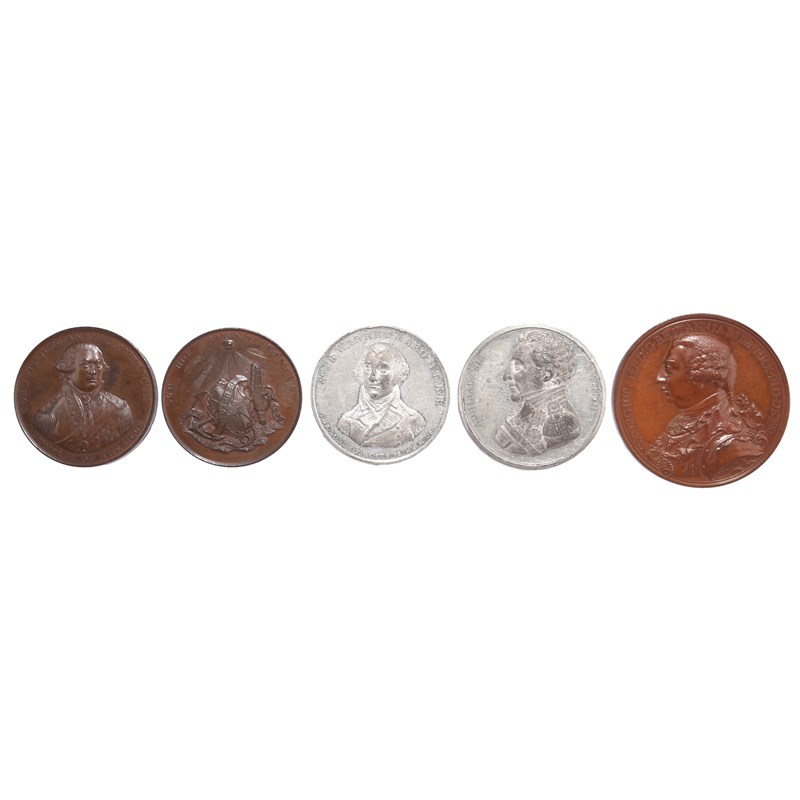 Five British historical medals commemorating naval and military victories: Battle of Camperdown 1797, AE, 38mm, bust of Admiral Duncan, rev. Britannia seated with laurels and a lion (E 887), nearly extremely fine; Battle of the Nile/ Entry of Ferdinand IV into Rome 1798, AE, 38mm, Victory seated with a lion in front of a Pyramid holding a medallion of Nelson, rev. shield and fouled anchor (E 892, Hardy 8), good very fine; Naval Action off Tory Island 1798, WM, 38mm, bust of Admiral Warren, rev. a naval engagement, 'THE SISTER COUNTRY AGAIN RESCUED FROM INVASION' (E 896), near very fine; British Victories 1798, AE, 48mm, bust of George III left, rev. Britannia surrounded by martial trophies holding Victory, by C.H. Küchler (E 897), good very fine or better; Siege of Acre 1799, WM, 41mm, bust of Admiral Sir Sidney Smith left, rev. a lion defends a camel from a tiger, by G. Mills/ N.G.A. Brenet (E 906), near very fine; all by T. Wyon Sr. unless otherwise stated. [5]