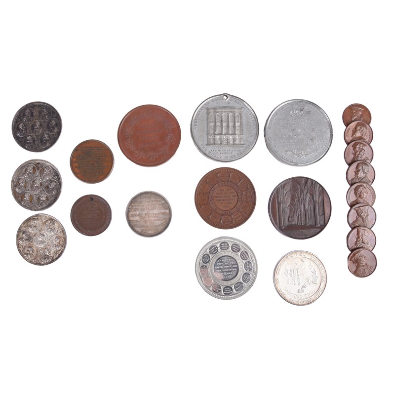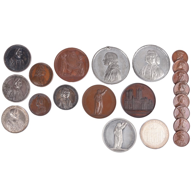 A quantity of medals on religious themes, comprising: Archbishop Sancroft and the Bishops 1688 (3), AR, 50mm and 48mm, bust of Sancroft right, rev. seven portrait medallions, cast (E 288b), good fine to about very fine; William Wake 1725, AE, 42mm, bust right, rev. 15 line inscription (E 500), good very fine; Death of John Wesley, AE, 39mm (E 839), pierced for suspension, otherwise very fine; Repeal of the Sacremental Test Act 1828, AE, 60mm (E 1199), extremely fine or nearly so; First English Bible Tercentenary 1835, AR, 43mm, bust of Myles Coverdale, rev. 13 line inscription (E 1283), nearly extremely fine; Centenary of Wesleyan Methodism 1839, WM, 65mm (E 1329), together with another similar, the first crudely pieced for suspension, the second good very fine; Church Missionary Society Golden Jubilee 1848 (2), AE and WM, 58mm (E 1422), extremely fine and nearly so; Lincoln Cathedral c. 1855, AE, 59mm, facade of the Cathedral, rev. interior, by J. Wiener (E 1504), good very fine or better; Thomas Becket 800th Anniversary of Martyrdom 1970, AR, 51mm (E 2122), extremely fine; Theologians (8), AE, 28mm, busts and inscriptions, by J. Dassier (E 361 et. al.), all about extremely fine. [21]