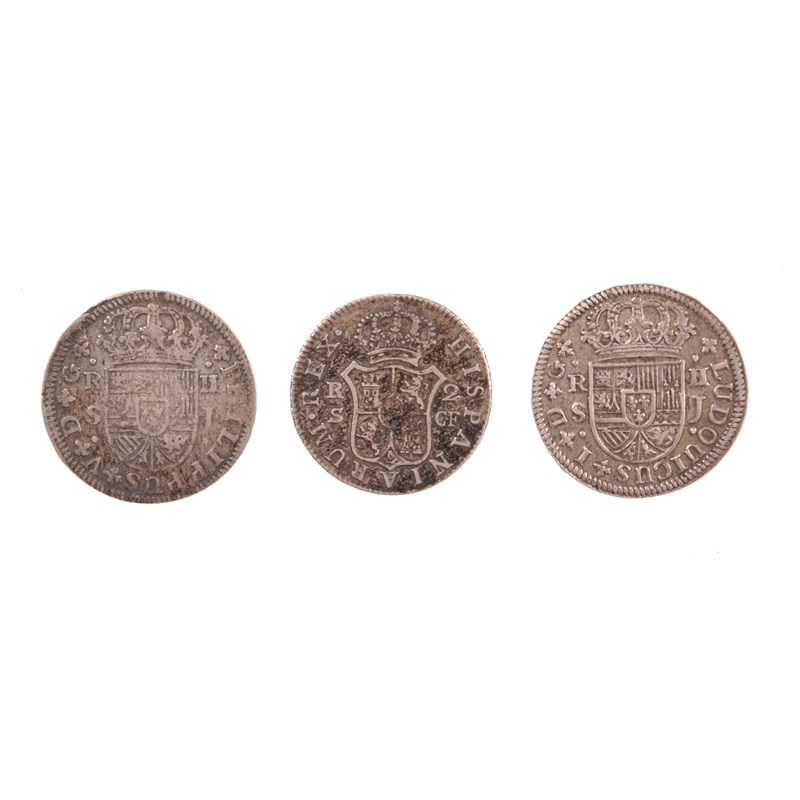 Spain: Philip V, silver two reales, 1724, slightly buckled, good fine; another two reales, Louis I, 1724, buckled, otherwise very fine; and another, Charles III, 1774, about very fine. [3]