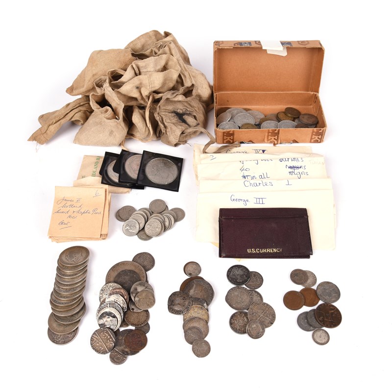 A quantity of coins, British and international, various issues and denominations, including 19th century base metal issues, British late pre-decimal issues, and others, mainly fine or very fine. [qty]