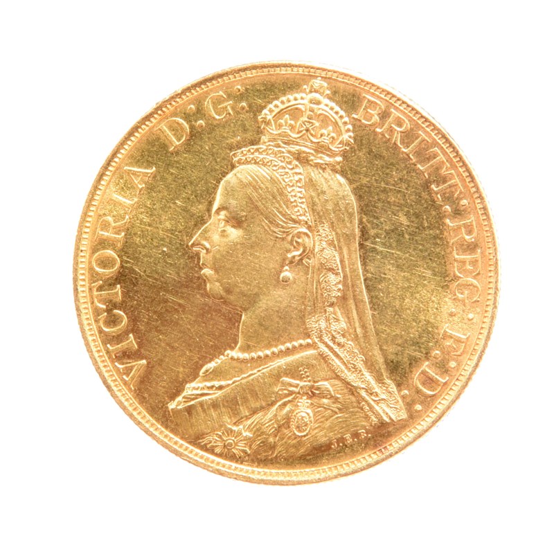 Victoria, gold five pounds, 1887 (S 3864), hairlining and minor marks to fields, otherwise about extremely fine.