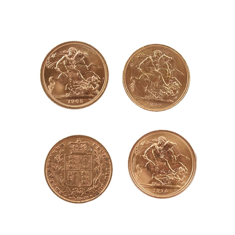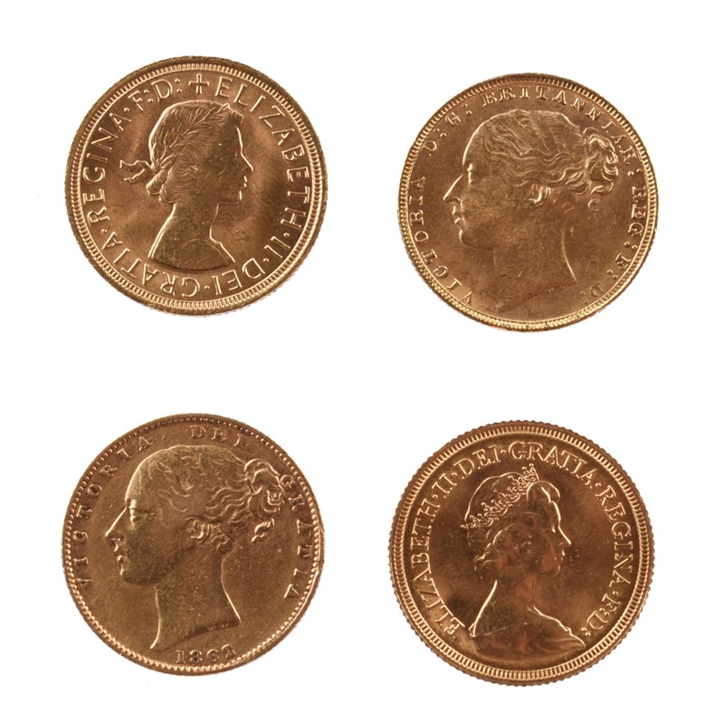 Four gold sovereigns: Victoria, 1862 (S 3852D), good very fine; 1880 (S 3856C), extremely fine; Elizabeth II, 1965 (S 4125), extremely fine or better; 1974 (S 4204), extremely fine or better. [4]