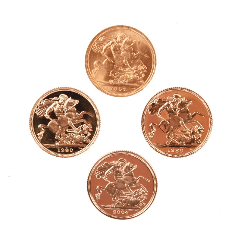 Elizabeth II, gold sovereigns (4), 1957 young head (S 4124), nearly extremely fine; 1980 (S 4204); 1986 (S 4271); 2004 (S 4430), the last three as struck; cased together in a Royal Mint 'Sovereign Portrait' set, in wooden case with outer box and certificate. [4]