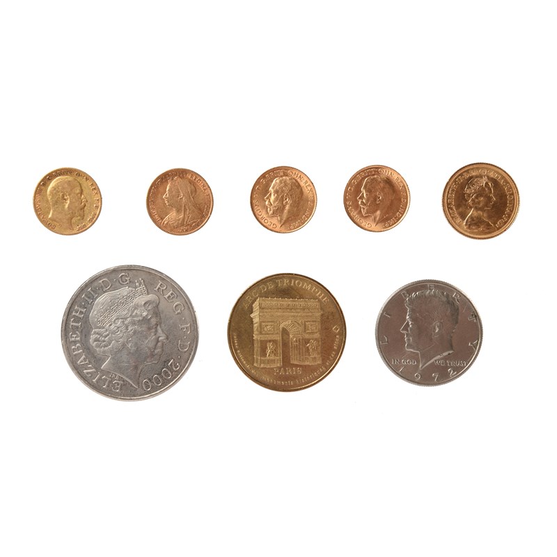 A small quantity of coins, comprising: Victoria, gold half sovereign, 1900, fine; Edward VII, gold half sovereign, 1906, good fine; George VI, gold half sovereigns (2), 1914, one very fine, one extremely fine or nearly so; Elizabeth II, gold sovereign, 1974, extremely fine or nearly so; commemorative five pounds, 2000, nearly extremely fine; U.S.A.: half dollar, 1972, good very fine; and a commemorative token, Paris, 2000. [8]