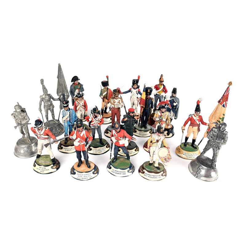 A collection of twenty pewter military figures, mainly after Charles Stadden and so marked on their bases, including: The Duke of Wellington, 1815; Napoleon Bonaparte, 1815; Light Company Private, Coldstream Guards, 1815; Drummer, 56th Foot, 1811; Private, Royal Marines, 1805; Corporal, R.M.L.I., 1902; N.C.O., Women's Royal Army Corps (R.M.P.), 1980; and others, all painted; together with three unpainted examples: Ensign, The Buffs; Private, Coldstream Guards (both c. 1815); and a soldier of the Royal Corps of Signals armed with a Sterling S.M.G. [20] nb. dates refer to the period represented, the models are all late 20th century.