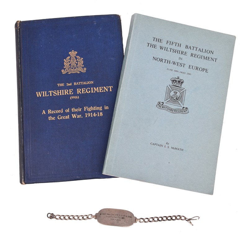 Wiltshire Regiment: a privately made post war bracelet, oval plaque impressed: 'SERGT MAJOR LEE D.C.M.& BAR HANTS/WILTS RGT 1914-19', marked 'Sterling', curb link chain; together with two regimental histories: Major W.S. Shepherd M.C., 'The Second Battalion Wiltshire Regiment (99th) A Record of their Fighting in the Great War, 1914-18', and Captain J.S. McMath, 'The Fifth Battalion the Wiltshire regiment in North-West Europe June 1944-May 1945'. [3]