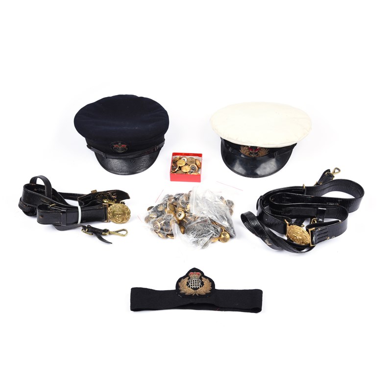 A collection of naval items and militaria, comprising: two naval officer's peaked caps, two naval sword belts, a quantity of military and livery buttons, and a British customs officer's cap badge.