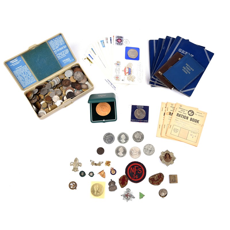 A small quantity of badges, including two silver ARP badges, a Swift Club badge and a Scouting Associate badge; together with a quantity of coins, mainly British 20th century, including commemorative crowns and later pre-decimal issues. [qty]