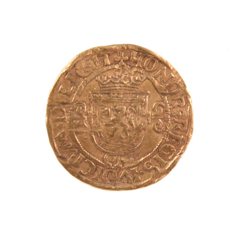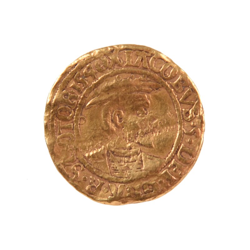 Scotland: James V (1513-42), gold ducat (bonnet piece), 1540, bearded bust right wearing bonnet, rev. crowned arms, 5.68g (S 5373), creased and with heavy abrasion to face and adjacent field, about fine.