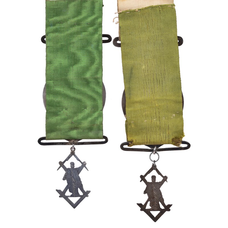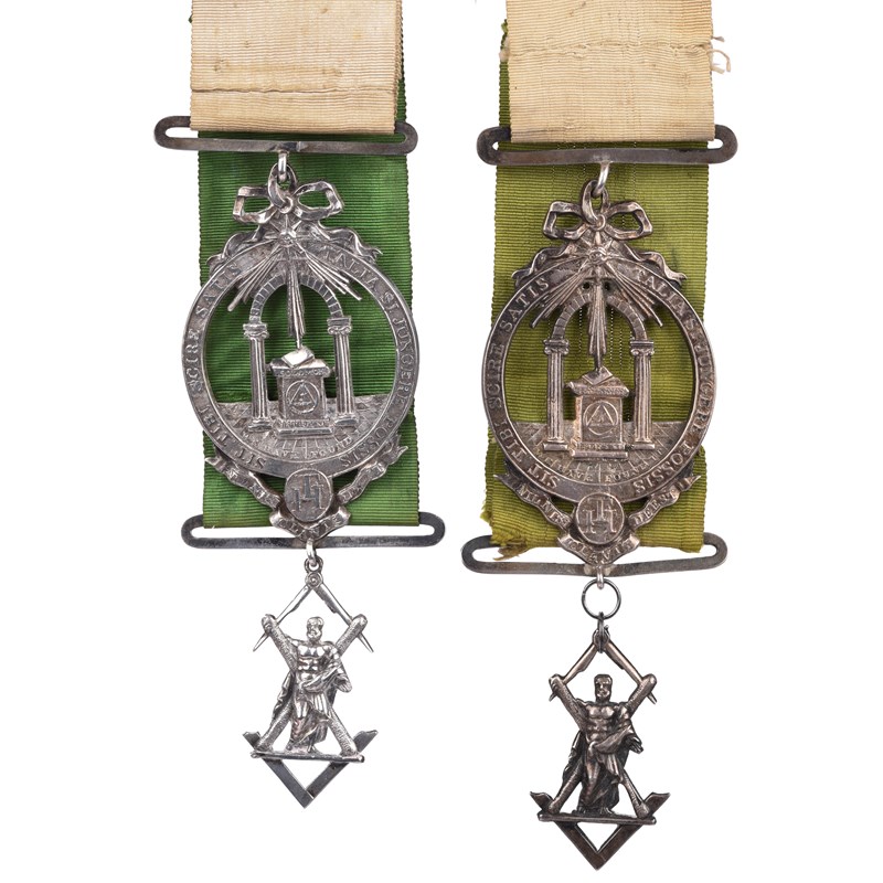 Scottish Freemasonry: a family pair of Grand Lodge Centenary Medals 1836, named to James M. Robertson and to H. Robertson, of matching openwork form 45mm wide, an arch within a circular border, lower extension with a banner incorporating a medallion with a triple tau, pendant figure of St Andrew with compasses and square above and below, suspension bracket in the form of a ribbon bow, the ribbon fixed to the top and bottom of the main ornament by straight bars, good very fine; cased together. [2]