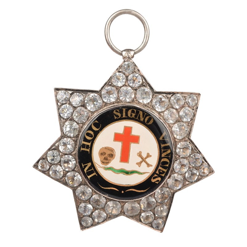 Templar Freemasonry: a 'Knights Templar' paste-set and enamel pendant star, seven pointed star 45mm, the points set with simulated diamonds, the centre with a glazed and enamelled roundel displaying a red Latin cross with a skull and crossed bones to either side and 'IN HOC SIGNO VINCES' to a blue border, ring suspension, 19th century, extremely fine; associated case.
