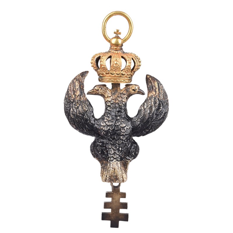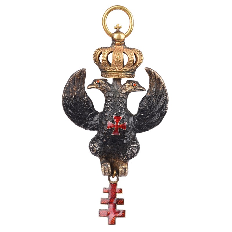 Freemasonry: a 19th century Rose Croix eagle jewel, gilt metal and enamel 48mm wide, bicapitate eagle with a red cross pattée to its breast, pendant three-bar red enamel cross below, articulated crown suspension, nearly extremely fine; associated fitted case.