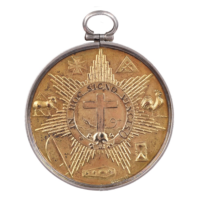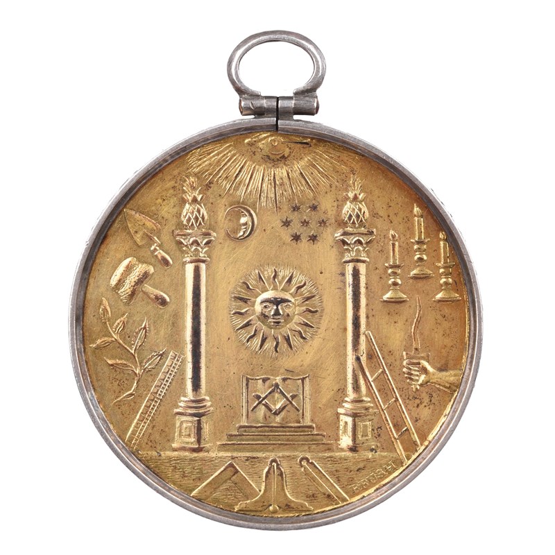 Freemasonry: a Georgian gilt 'Brush Jewel', circular form 44mm, each side covered in Masonic emblems in relief, held in a loose mount supporting a hinged suspension ring, the edge of the mount engraved 'GIFT of BR HUNTER to HIS SON 24 SEP 1802', good very fine or better.