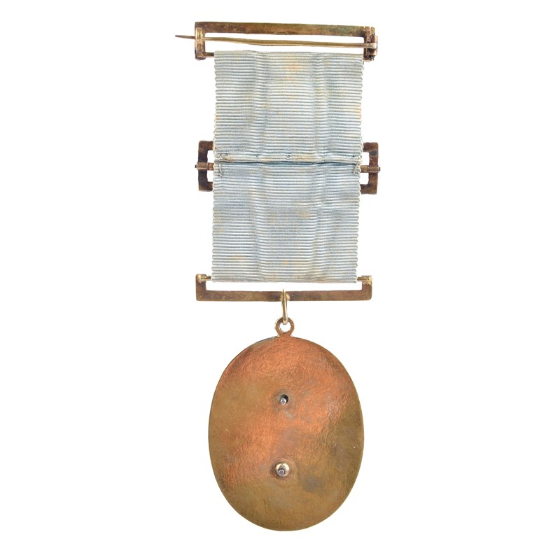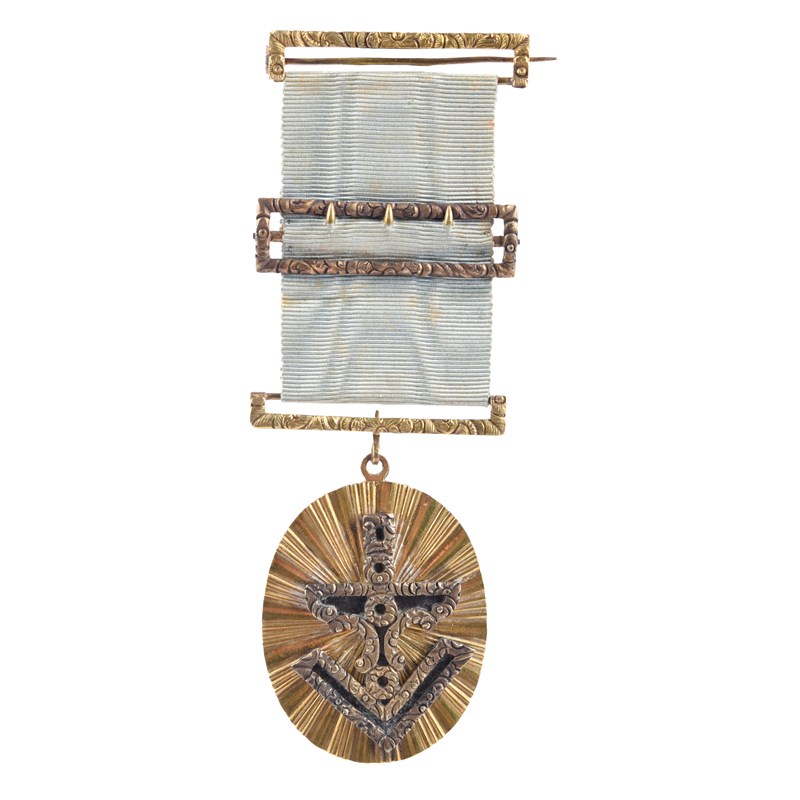 Freemasonry: a gilt-metal symbolic jewel, oval form 40mm, applied level and square with flower-cut detailing, radially fluted ground, upper and lower suspension bars and ribbon buckle all formed of flower-cut bars, good very fine or better.
