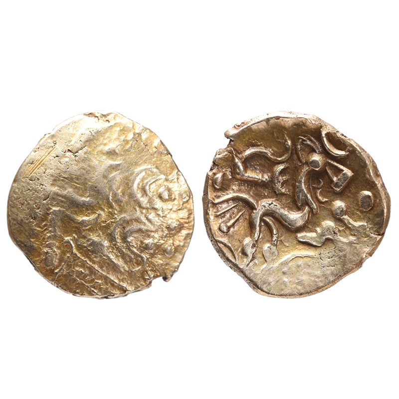 British Celtic coinage: gold stater, possibly Atrebates, devolved Apollo head, rev. disjointed head, 4.83g, good fine or better.