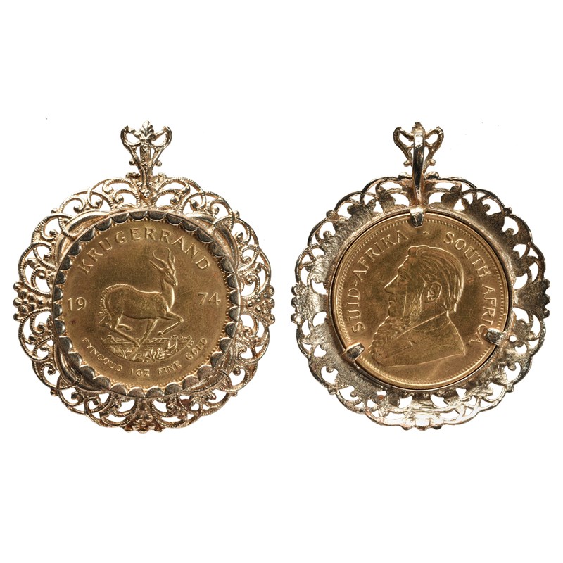 South Africa: gold krugerrand, 1974 (KM 73), loose mounted in a 9 carat gold pendant setting with scrolling border, London 1977, coin better than good very fine.