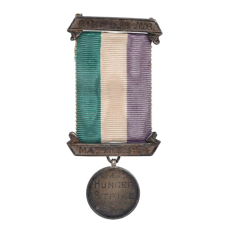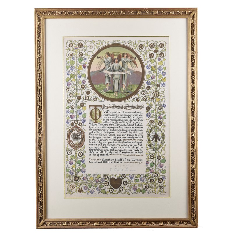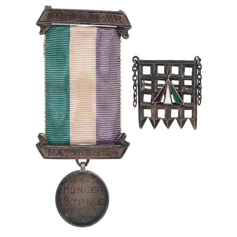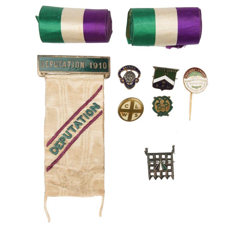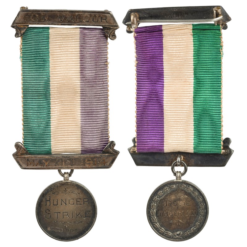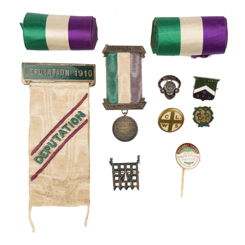 Women's Social and Political Union: the Suffragette Medal and associated items to hunger striker Jessie Landale Cumberland, the medal an engraved silver disc, 'HUNGER STRIKE', rev. 'JESSIE CUMBERLAND', upper and lower suspension bars of banner form, the upper engraved 'FOR VALOUR' and the lower 'MAY 21ST 1914', the ribbon of three equal vertical stripes in the W.S.P.U. colours of green, white and purple, Toye & Co, Birmingham 1913; together with Miss Cumberland's portcullis badge, indicating imprisonment in Holloway Jail, square lattice form with spiked lower projections with applied broad arrow motif enamelled in the W.S.P.U. colours; the illuminated printed address associated with the award of this medal and bearing the stamped signature of Emmeline Pankhurst and the M/S signature of Emmeline Pethick-Lawrence; the ribbon and upper brooch fitting for a pendant badge, 'DEPUTATION 1910' to the enamelled brooch, the ribbon embroidered 'DEPUTATION'; a W.S.P.U. enamelled badge, 'VOTES FOR WOMEN', green over purple divided by a white chevron; a National Union of Womens Suffrage Societies enamelled pin badge; a Church League for Women's Suffrage badge; two sections of 2.25 inch silk ribbon in the W.S.P.U. colours (possibly from a sash); also offered: a Girl Guides green enamelled 'B.P.' adult guider's badge, and a British Legion badge. [qty]