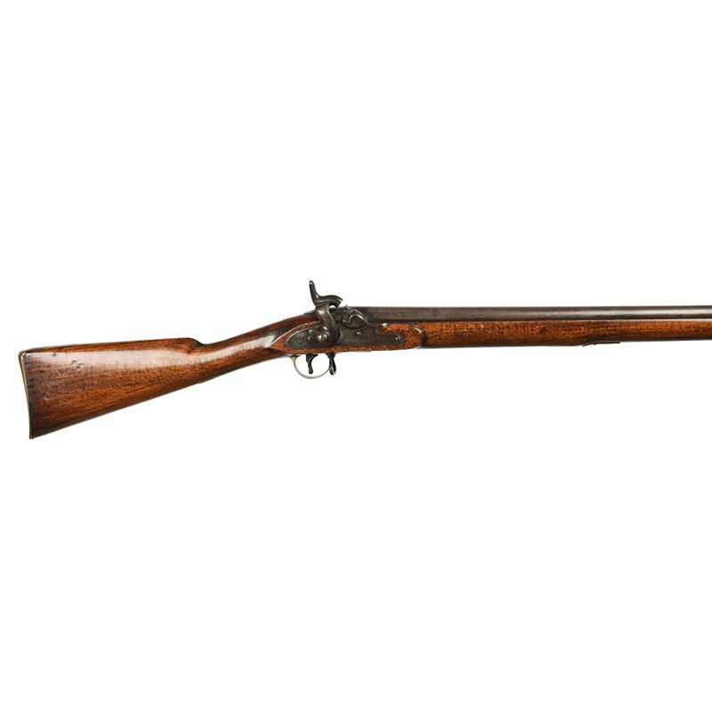 A British .76 calibre composite percussion musket, barrel 39 in., percussion breech threaded on, Birmingham control marks to both parts and an older London view mark in front of the seam, lock marked 'TOWER' and with a crown (both possibly spurious), stocked to within 4 in. of the muzzle with brass furniture including two ram rod pipes, stock secured with pins, iron sling swivels, button head ram rod. The general configuration conforms to the India pattern musket - presumably a trade conversion to percussion, possibly for export.
