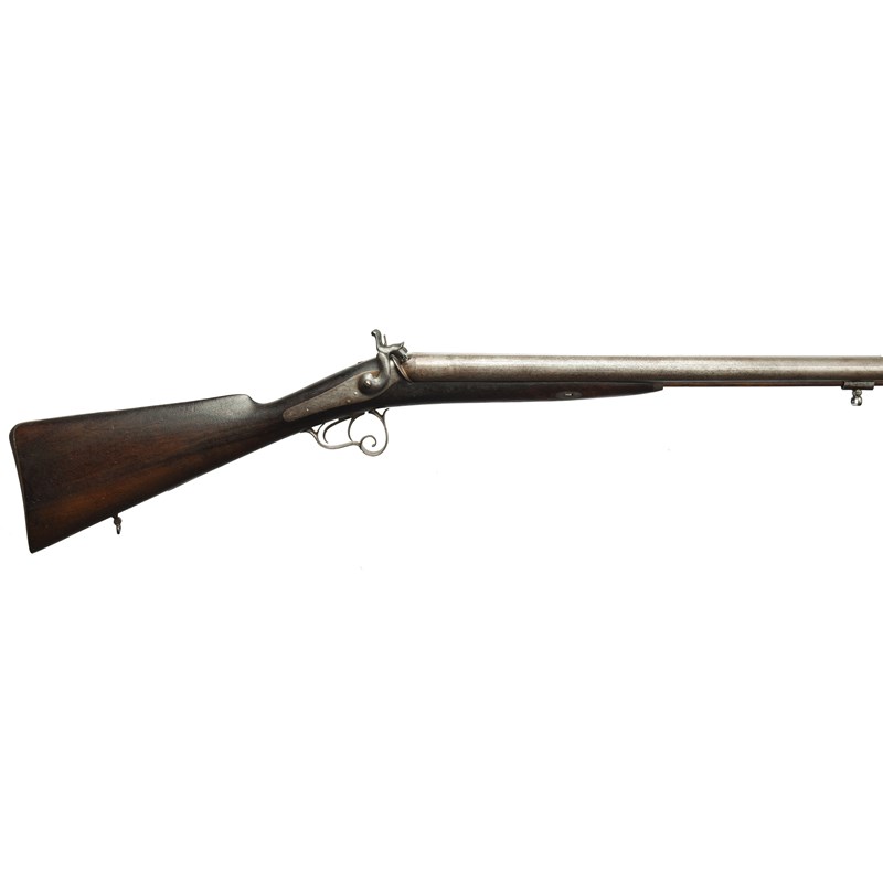 A 14 bore percussion double gun, barrels 34 in, hollow top rib, adapted for use with ball by the addition of a back sight to the tang, back action locks, walnut straight hand stock, steel furniture including a scrolling Continental type trigger guard, steel tipped wooden ramrod.