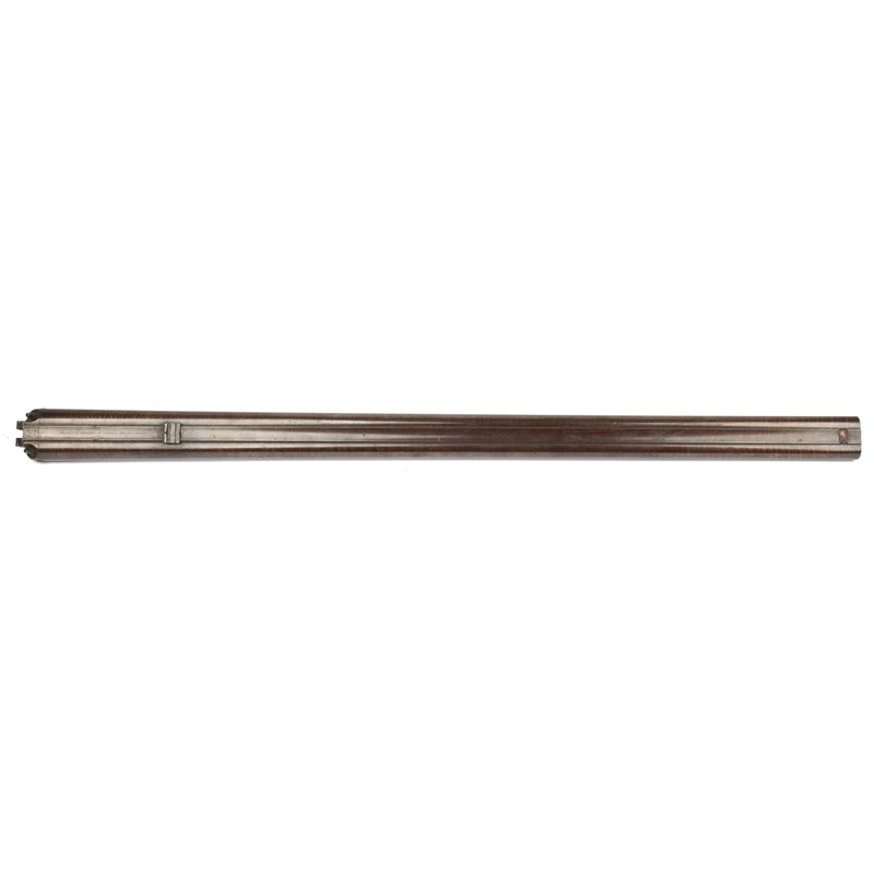 A pair of English 'damascus' percussion double rifle barrels, approximately 16 bore, 29.75 in., nine-groove rifling, hollow top rib inscribed 'MOORE & HARRIS. ST MARY'S. BIRMINGHAM', hook breech engraved with the head of a big cat, Birmingham proof marks, standing back sight with two folding leaves, numbered 1251.