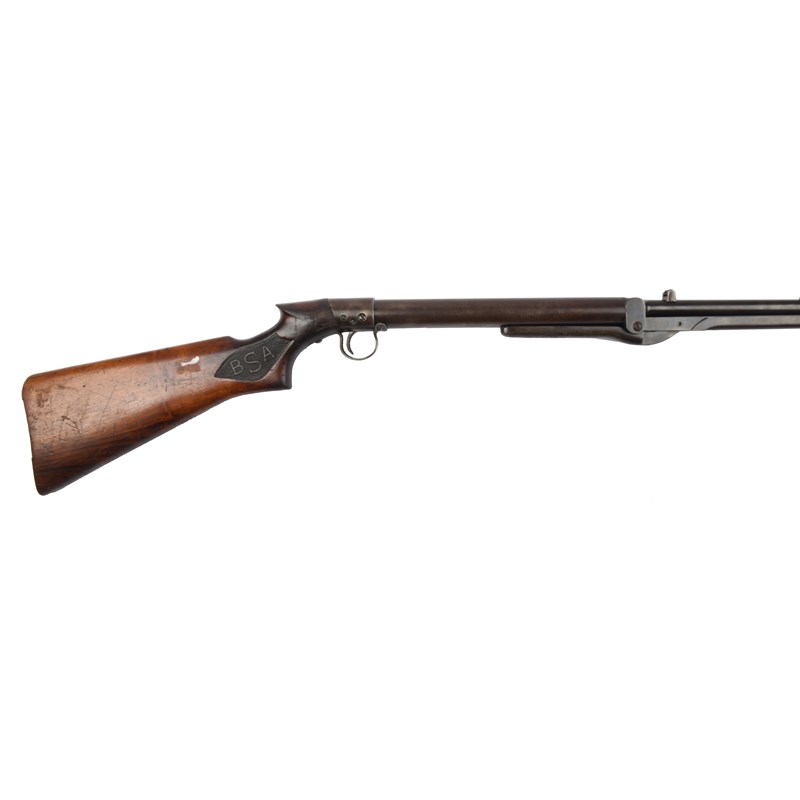A pre-Second World War .22 air rifle by B.S.A., serial number S42120, under-barrel charging lever and rotating loading gate, elevation adjustable back sight, pistol grip butt, chequered panels embossed 'B.S.A.'.