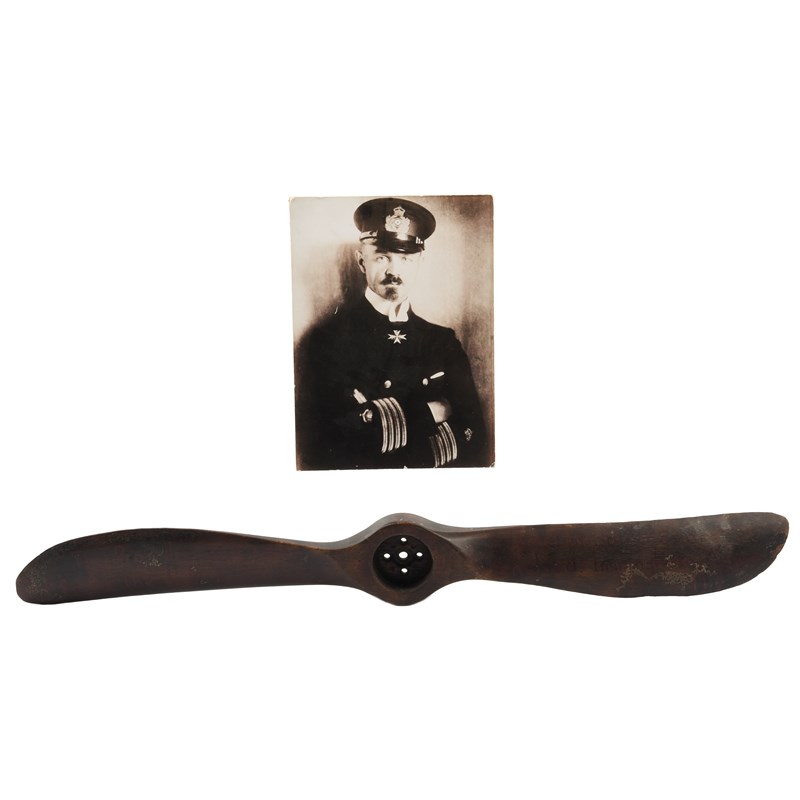 A Great War Zeppelin relic, being a wooden propeller salvaged from Zeppelin LZ112 (airship L70), the last Zeppelin to be shot down during the war, 79.35 cm long, the blades curved along one edge, the central depression pierced for bolts, painted with the words "This Propeller was taken from the last Zeppelin to be shot down over England. Immingham August 1918"; together with a reproduction of a portrait photograph of Commander Peter Strasser, who died in command of L70. [2]